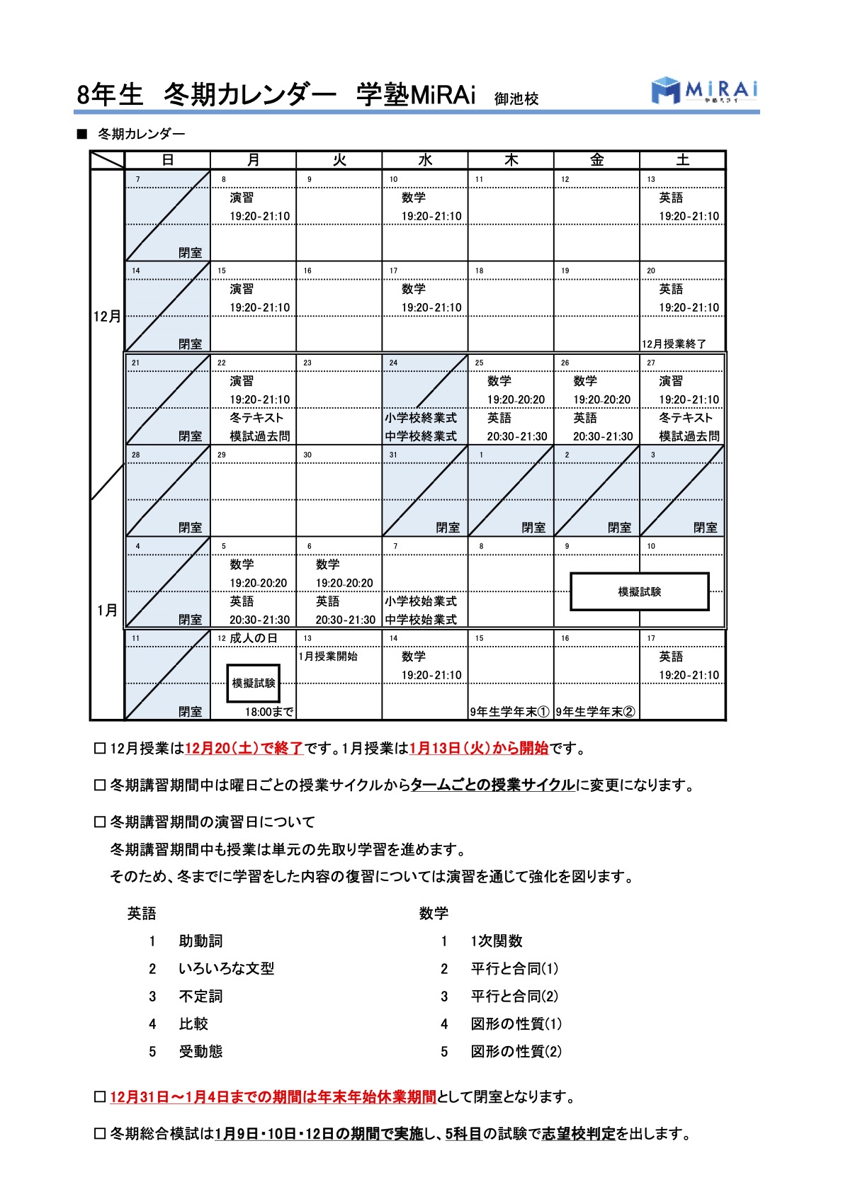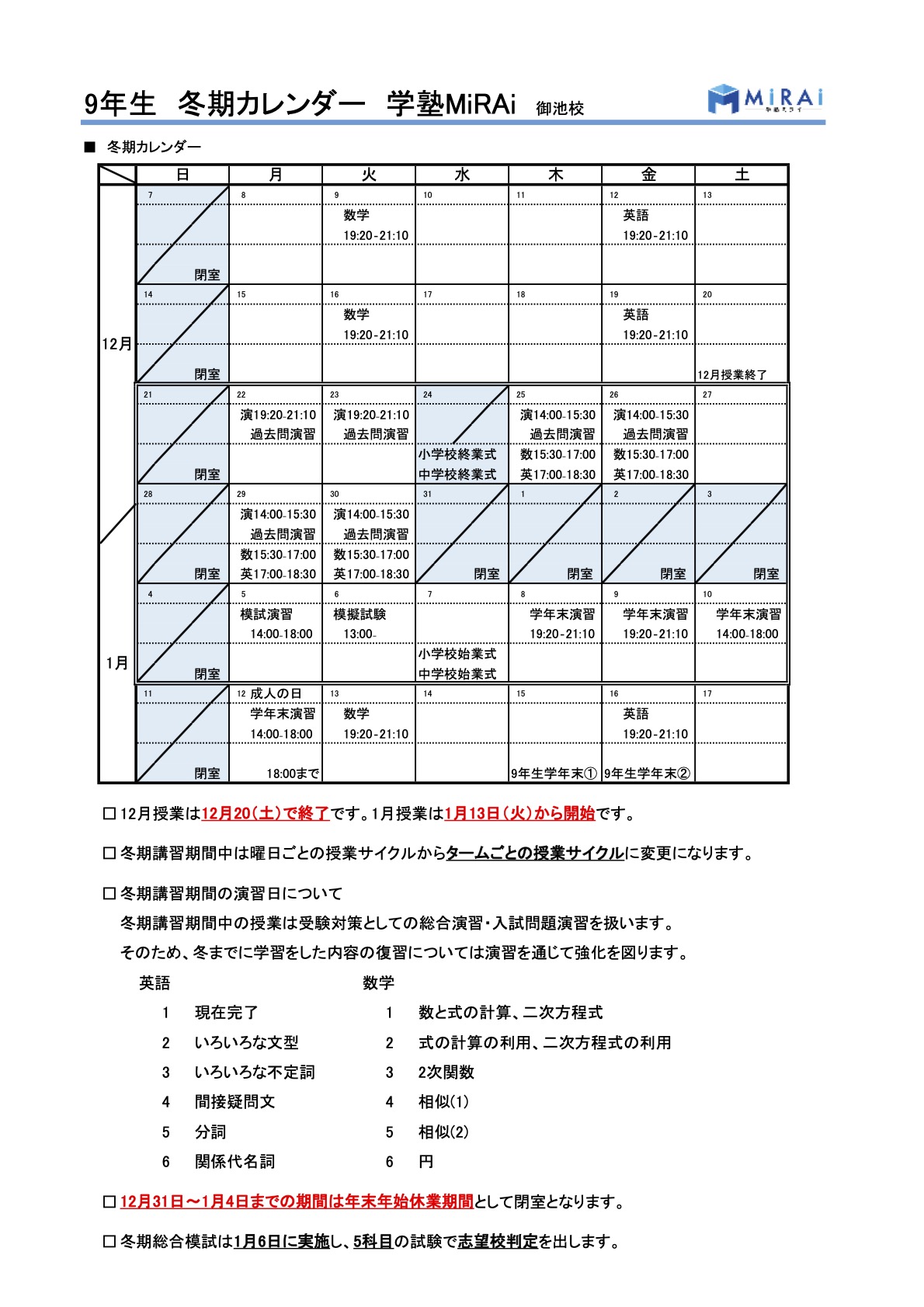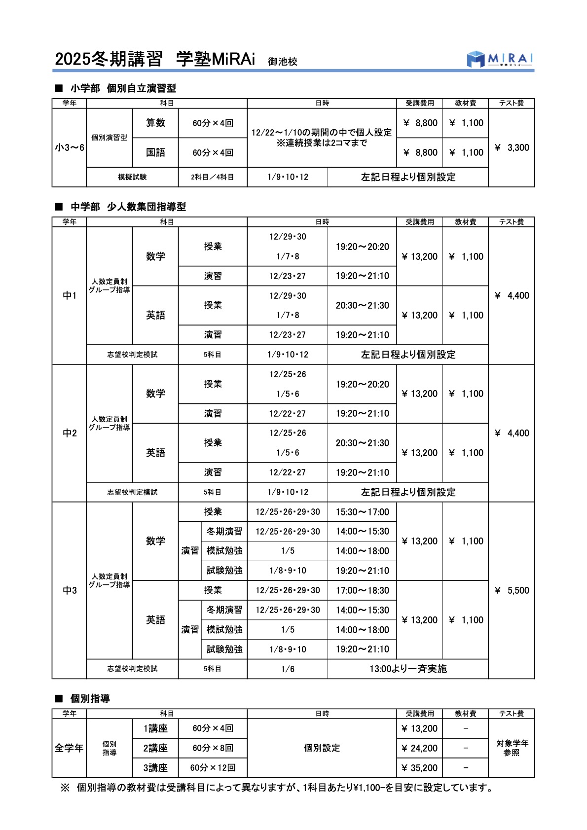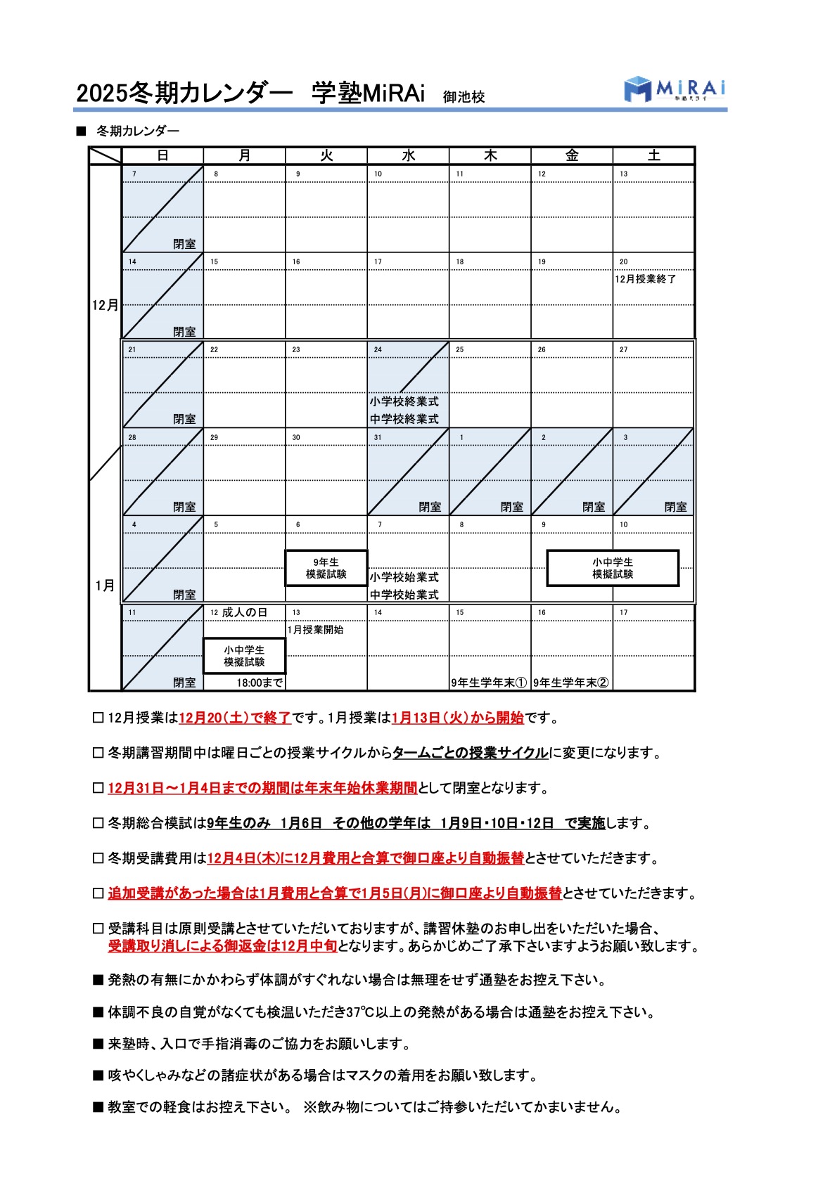 冬期講習2025のご案内 こちらからPDFの案内書類一式をダウンロードできます 学塾ミライ冬期講習2025 冬期講習の受講費用一覧 冬期講習カレンダー 冬期総合模試予定 こちらからPDFの案内書類一式をダウンロードできます 学塾ミライ冬期講習2025 お問い合わせはこちら!