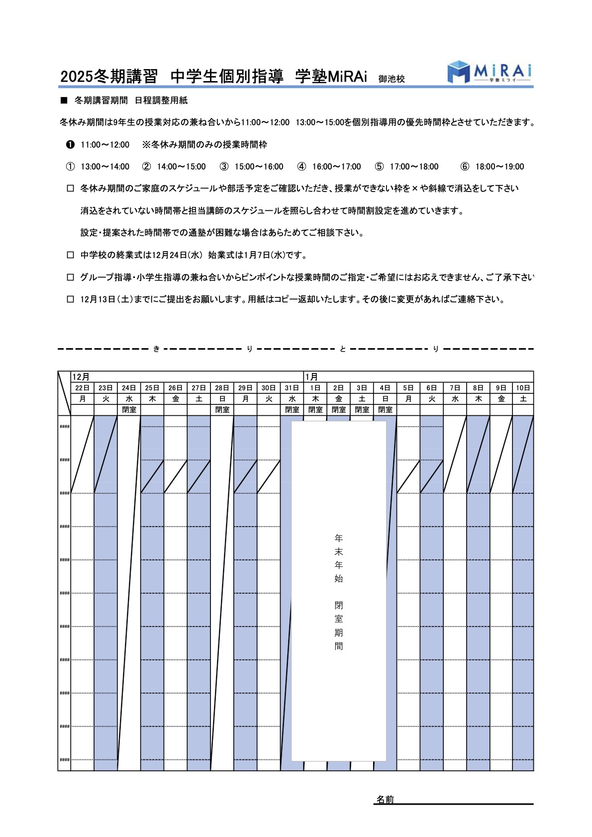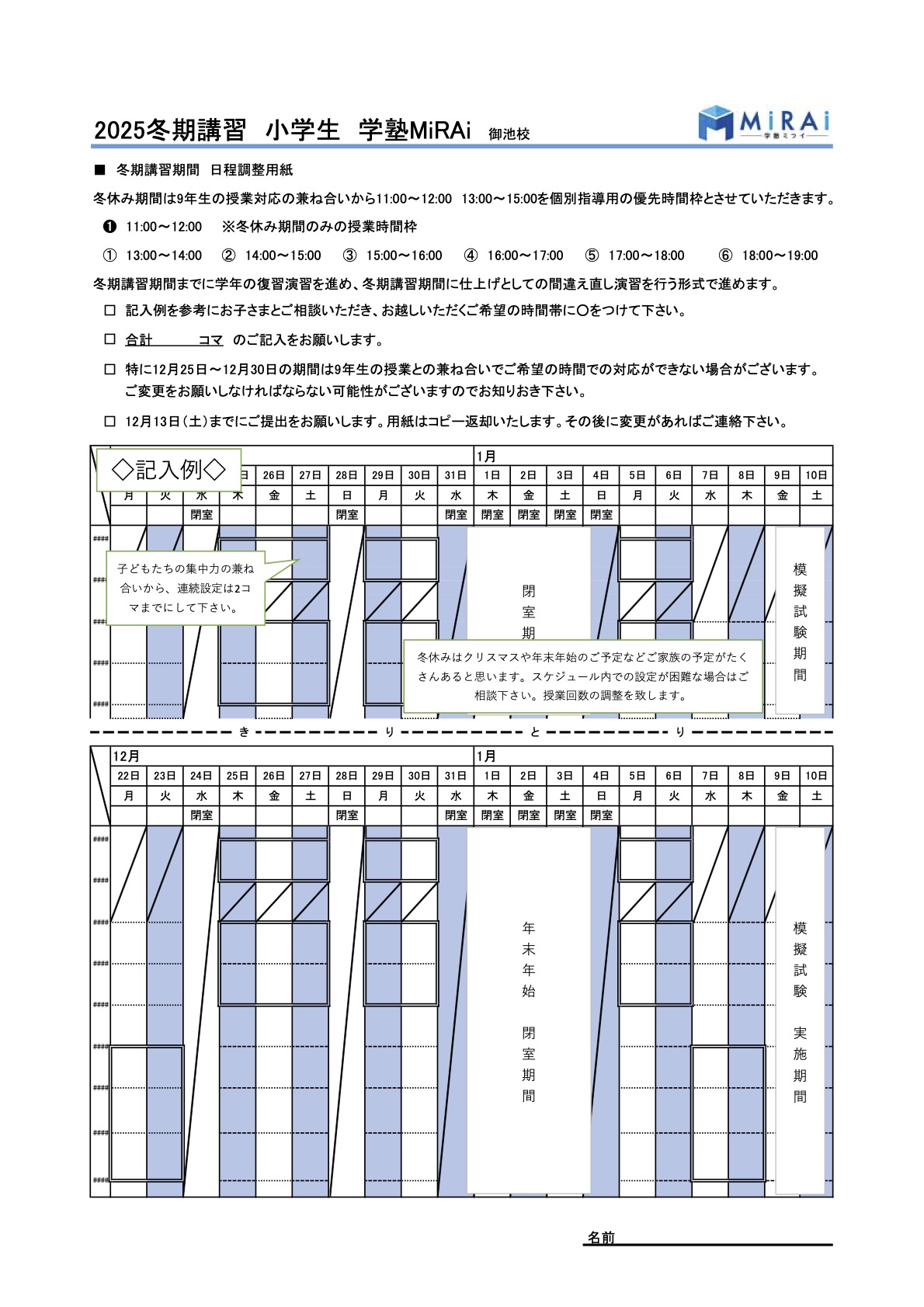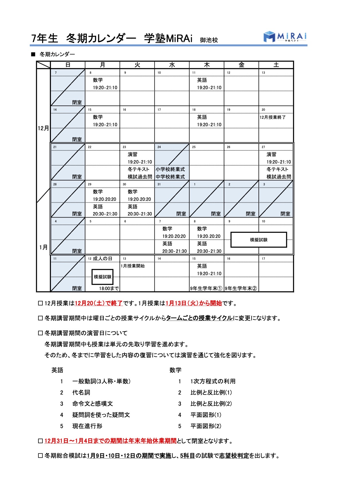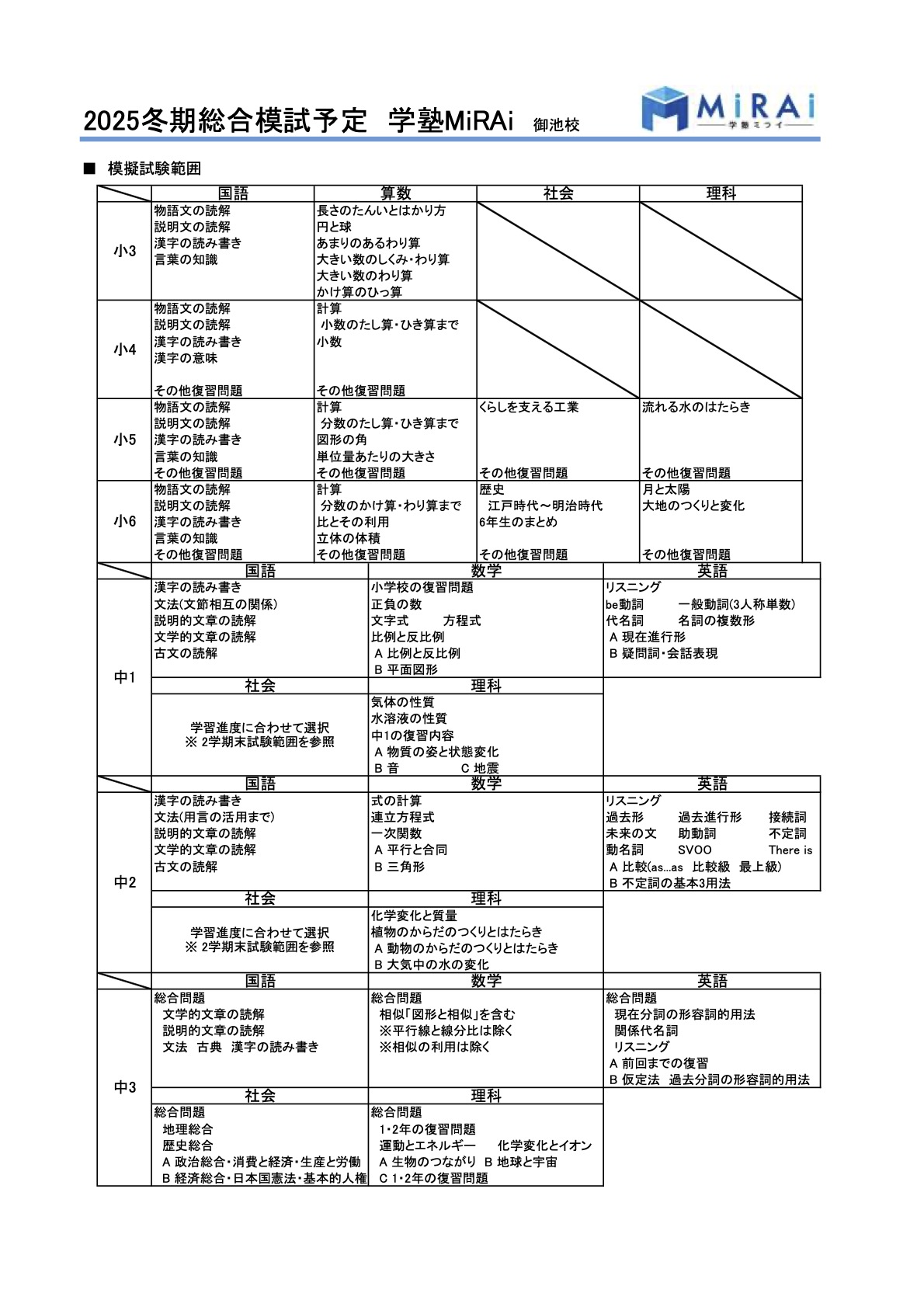 冬期講習2025のご案内 こちらからPDFの案内書類一式をダウンロードできます 学塾ミライ冬期講習2025 冬期講習の受講費用一覧 冬期講習カレンダー 冬期総合模試予定 こちらからPDFの案内書類一式をダウンロードできます 学塾ミライ冬期講習2025 お問い合わせはこちら!